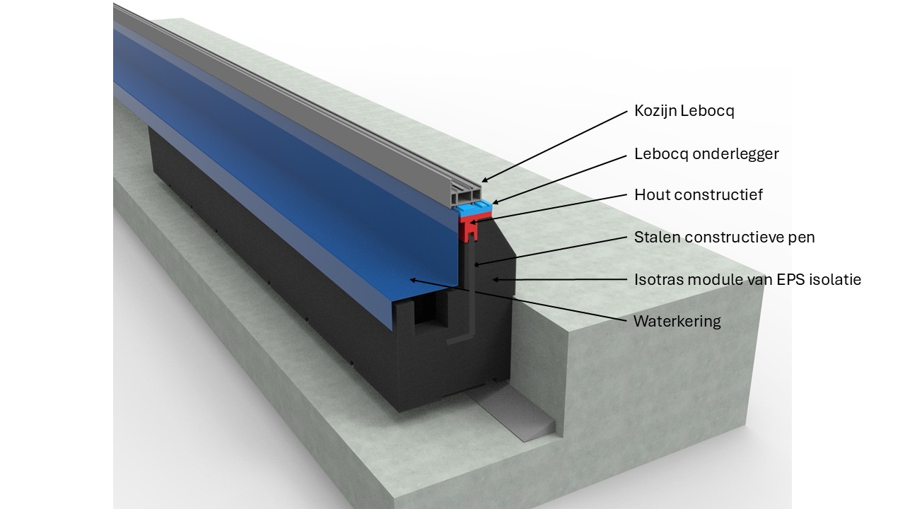Onder elk kozijn zit een risico: een koudebrug. Om dat goed op te lossen, werken we samen met ISOTRAS. Onze aluminium kozijnen rusten op stalen pennen. Daardoor is het contactvlak met de koude fundering minimaal.